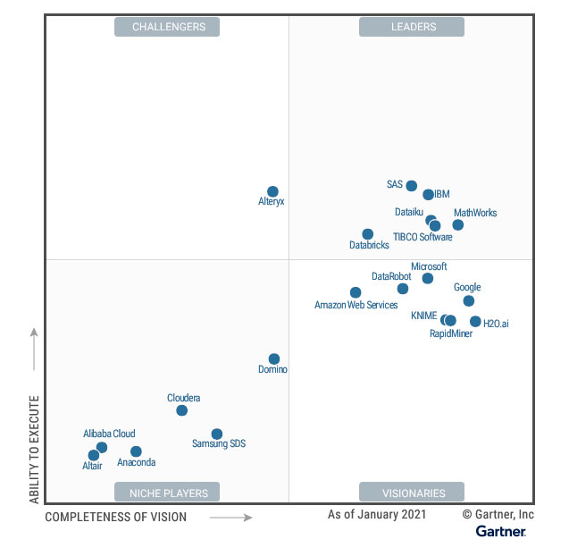 Gartner – это исследовательская и консультационная компания, которая регулярно публикует отчеты и оценки различных игроков на различных технологических рынках, включая AutoML. Согласно Магическому квадранту Gartner для платформ AutoML, лидерами рынка по состоянию на 2021 год являются следующие игроки (состав игроков 2021/2019 принципиально не изменился).
