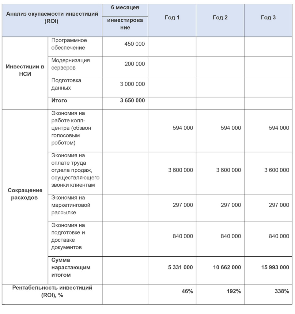 Управление мастер-данными требует инвестиций, но рентабельность превышает затраты. Вот пример анализа окупаемости инвестиций в проект НСИ для клиентской базы телеком-провайдера с 15 тысячами абонентов и 100 тысячами потенциальных клиентов. В процессе внедрения НСИ в результате очистки и консолидации клиентских баз были получены следующие положительные эффекты: