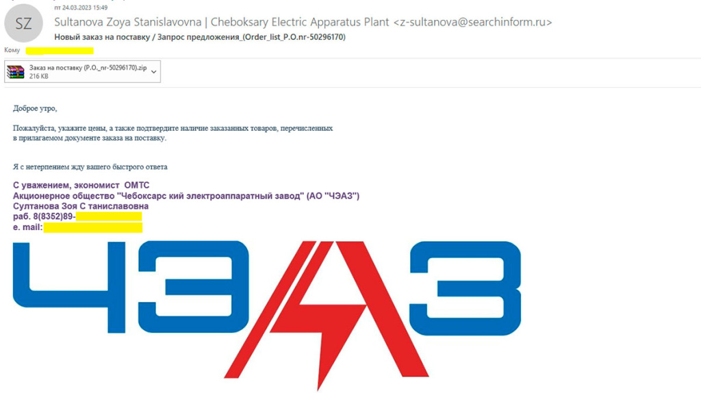 В таких письмах следует внимательно проверить почту отправителя, в нашем случае есть расхождения в названии домена и компании-отправителя. Однако, возможно, это сделали просто для привлечения внимания, так как в подписи указана существующая почта с правильным доменом. В письме есть несколько опечаток, поддельные письма часто содержат в себе ошибки. Телефон из подписи не опубликован в открытом доступе, но после сравнения с номерами на сайте компании можно сказать, что он близок к настоящему.