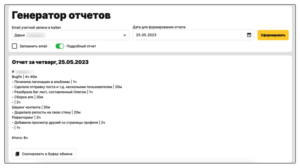 - Формировать отчет за день по конкретному сотруднику. На основе данных из Kaiten Reporter в один клик показывает все затраченные часы сотрудника и комментарии по ним.