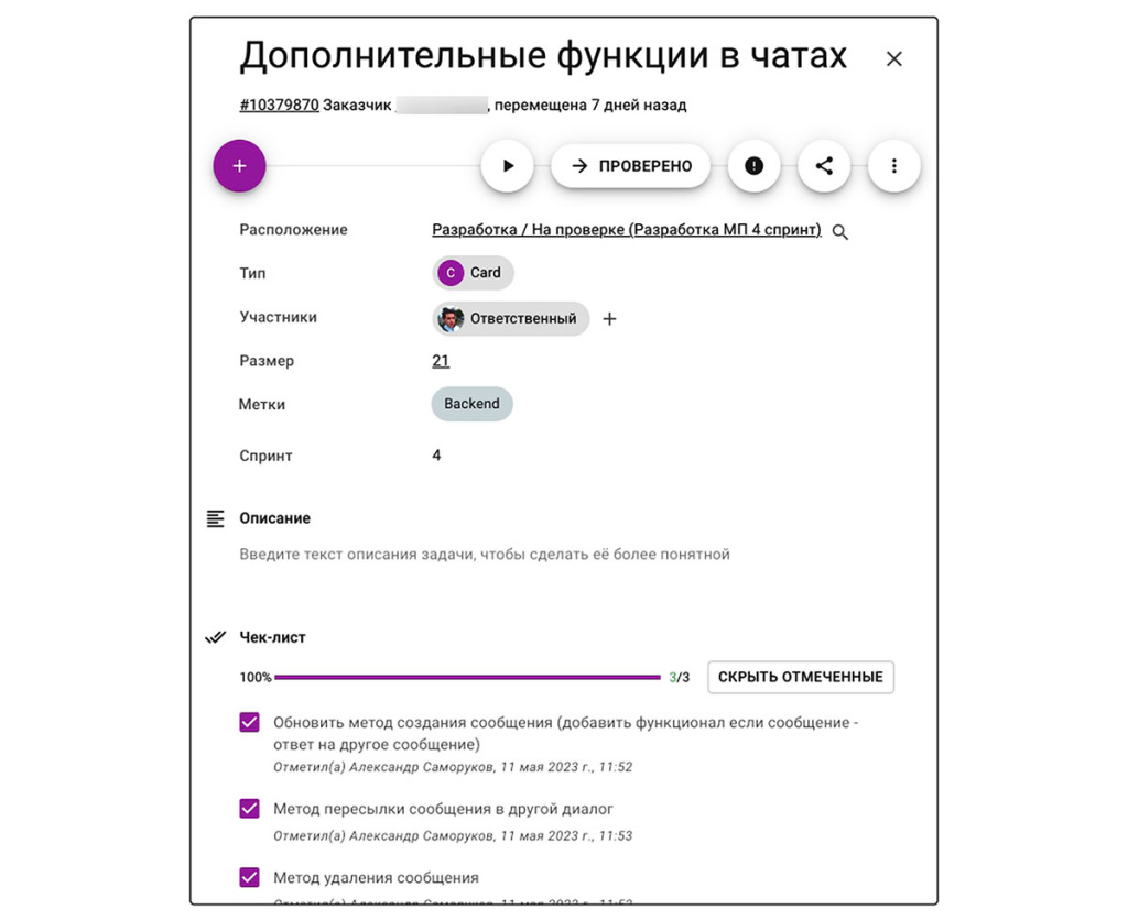 Активно применяем чек-листы, которых может быть несколько в одной карточке. Обычно один чек-лист описывает бизнес-логику, как задача должна быть сделана, а другой — тест-кейс, регулирует взаимодействие тестировщика с разработчиком.