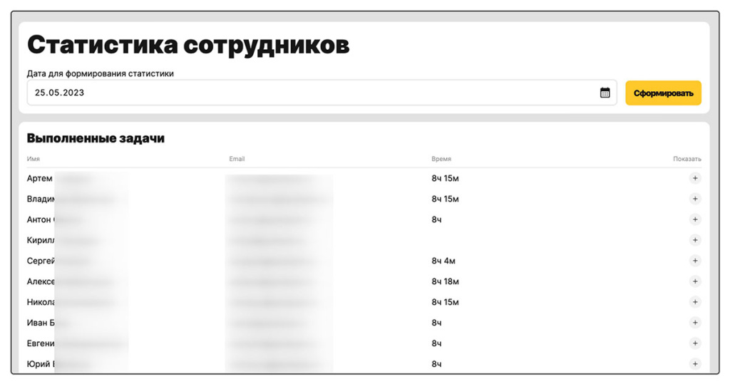Показывать статистику по всем сотрудникам. Сколько часов они отработали за конкретный день.