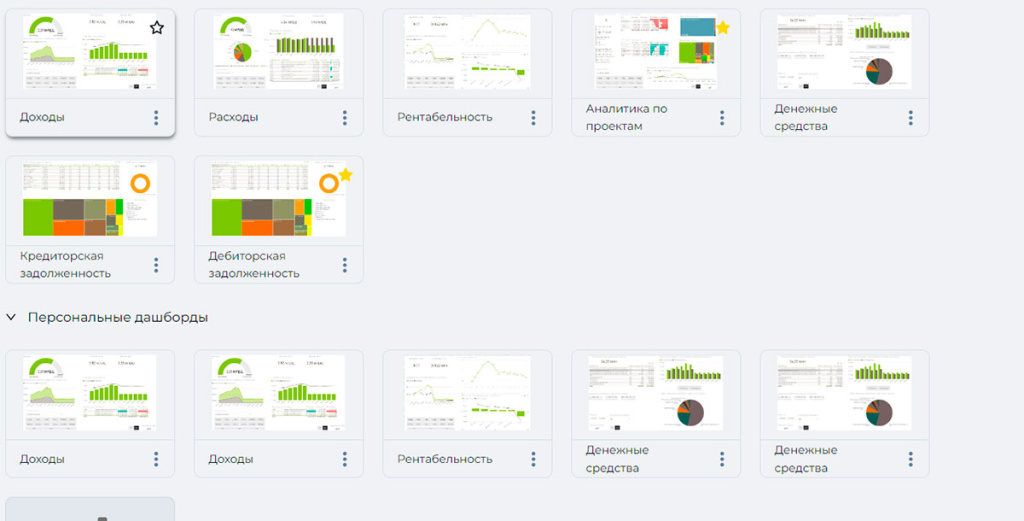 Дашборд – это информационная панель с вашими данными. На ней отображаются различные показатели вашей компании. Вы можете выбрать различные разрезы этих показателей, например, в финансовой отчетности в разрезе ЦФО, статей дохода/расхода, филиалов, периодов.