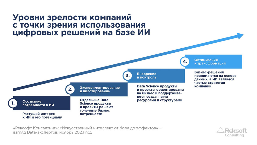 Подводя итоги исследования, Алексей Богомолов, директор практики «Стратегия трансформации» «Рексофт Консалтинг» сказал: «ИИ часто воспринимается как «модная игрушка», при этом упускается самое главное – ИИ должен давать компании системный трансформационный эффект. Необходимо создание технологической и организационной базы для системного развития цифровых продуктов от прототипирования до получения эффекта. Здесь стоит задуматься над созданием «цифрового конвейера» в купе с бизнес-трансформацией самой компании. В результате ИИ должен стать понятной и привычной технологией для бизнеса – повседневным рабочим инструментом, интегрированным в текущие бизнес-системы такие как ERP м CRM-системы и аналитику».