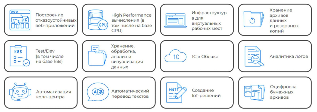 Внутри облака это сделать значительно проще. Все крупные облачные провайдеры, помимо базовых инфраструктурных сервисов, имеют в своем арсенале широкий набор специализированных сервисов для улучшения бизнес-процессов: от чат-ботов и голосовых роботов до рекомендательных систем и инструментов для работы с большими данными. Поэтому у заказчиков есть возможность быстро внедрять и тестировать новые технологии.