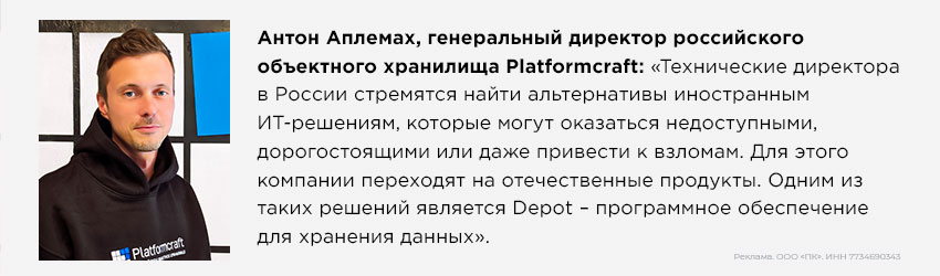 Меня зовут Антон Аплемах, я генеральный директор российского объектного хранилища Platformcraft, и в этой статье я расскажу, как правильно внедрять такие системы, какие выгоды они принесут компаниям и как развернуть решение Depot в своей инфраструктуре.