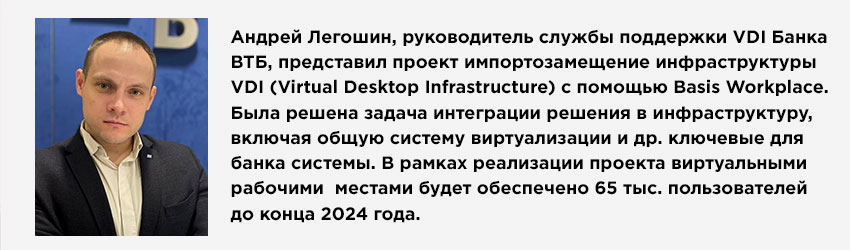 В проекте можно выделить три ключевые задачи. Во-первых, требовалось отказаться от использования американской разработки Citrix в пользу системы управления инфраструктурой виртуальных рабочих столов от российского разработчика «Базис». Во-вторых, новое решение следовало адаптировать под собственную платформу виртуализации VTB.Cloud. И, наконец, необходимо было создать внутренний центр компетенций для дальнейшего сопровождения и масштабирования систем, поскольку для банка критично, чтобы сервисы по поддержке находились в собственном контуре, а не у сторонних интеграторов.