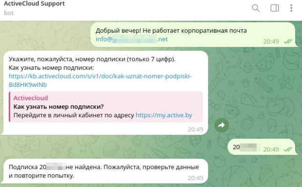 В случае технической консультации бот из контекста способен определить, по какой услуге задан вопрос. Если услуга не имеет вариативности, бот произведет поиск информации для подготовки ответа в базе знаний. Если услуга имеет несколько вариантов (например, почтовая услуга или услуга хостинга), бот запросит номер подписки и домен (почтовый или веб-сайта).