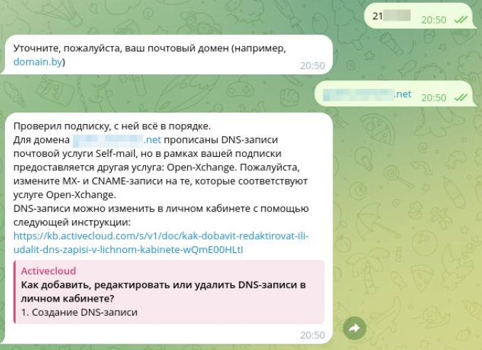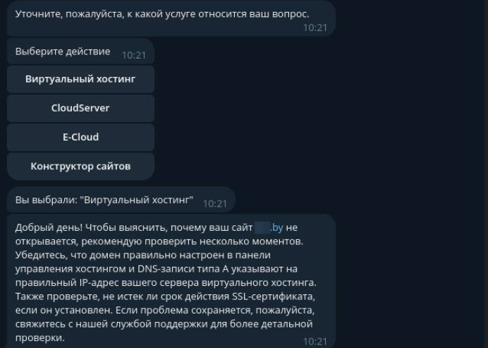 Бот проверяет домен: статус, наличие и соответствие необходимых DNS-записей, SSL-сертификата. Если все корректно, он формулирует ответ на основе информации Базы знаний.