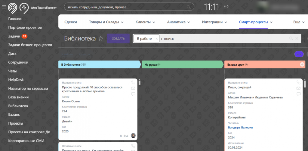 Также на базе Битрикс24 мы запустили симпатичный сервис по управлению корпоративной библиотекой (да, у нас есть такая, с настоящими книжками): можно посмотреть общий список книг, выяснить, у кого какая в данный момент на руках и когда вернется обратно на полку.