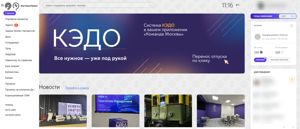 Начали с базового функционала: вместо устаревшего портала внедрили полноценный справочник сотрудников с удобной структурой, фотографиями, должностями, контактными данными. Также добавили сервис бронирования переговорок, что значительно упростило процесс планирования встреч.