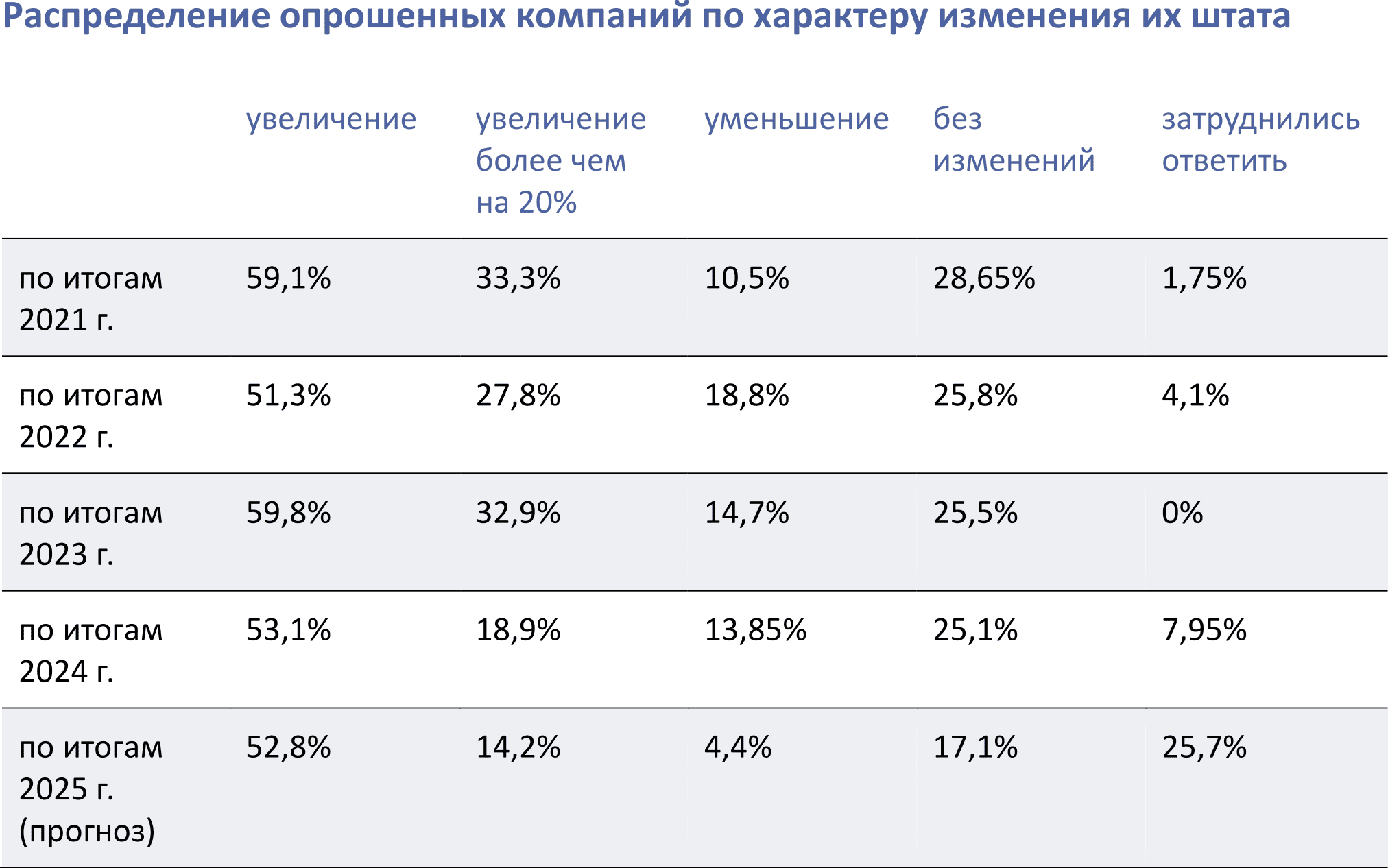Прогнозируемый прирост численности персонала в 2025 г. у всех типов компаний превышает 12%. Традиционно фактический рост оказывается ниже прогнозируемого. Для роста больше чем на 12% просто, скорее всего, не будет соответствующего предложения на рынке труда.
