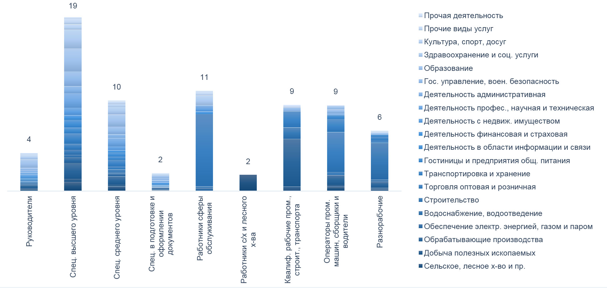 | Руково-дители | Спец. высшего уровня квалиф. | Спец. среднего уровня квалиф. | Спец., занятые подготовкой и оформлением документации, учетом | Работники сферы обслуживания и торговли |