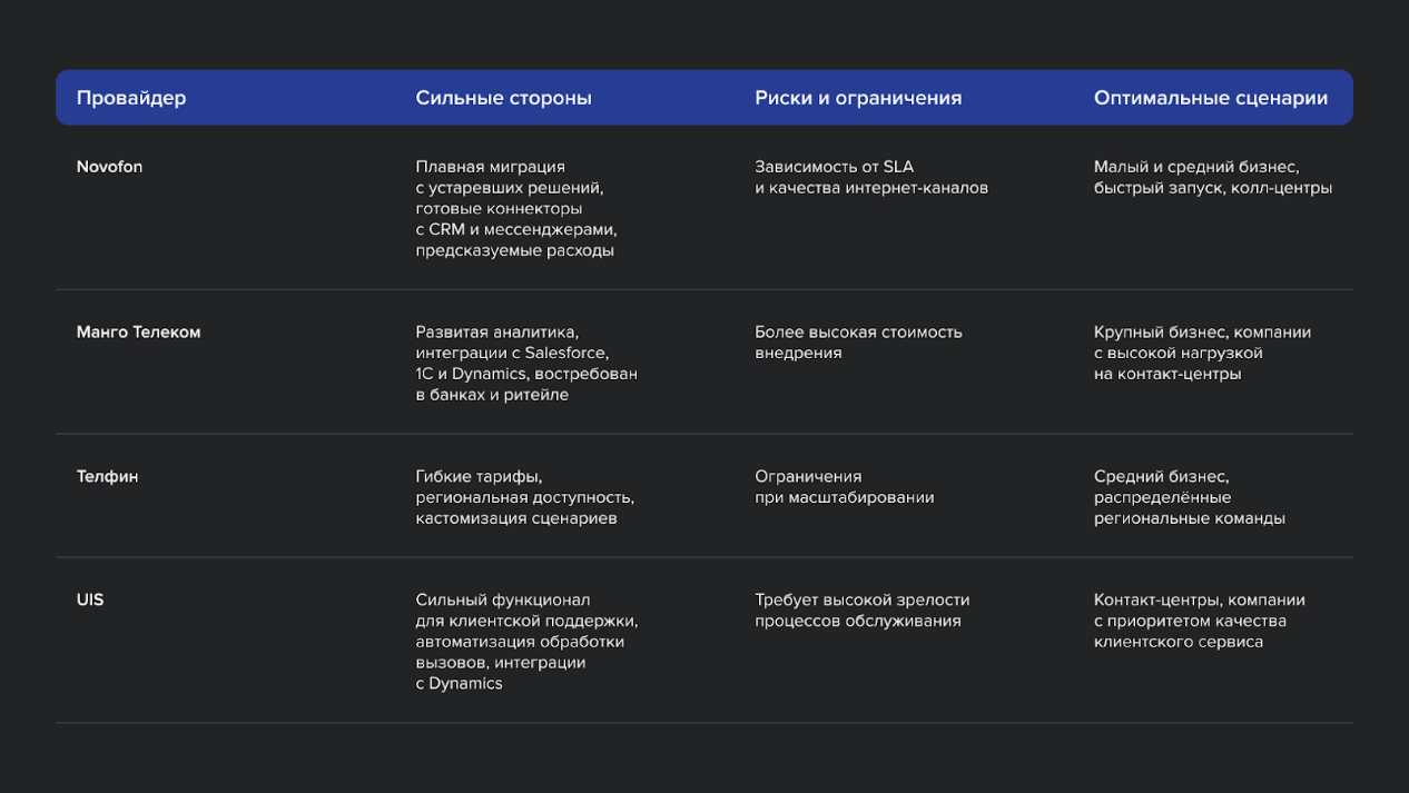 Такой подход позволяет сразу увидеть, какие задачи лучше решает каждый из провайдеров, и избежать выбора «по рекламе», сосредоточившись на практической пользе для бизнеса.