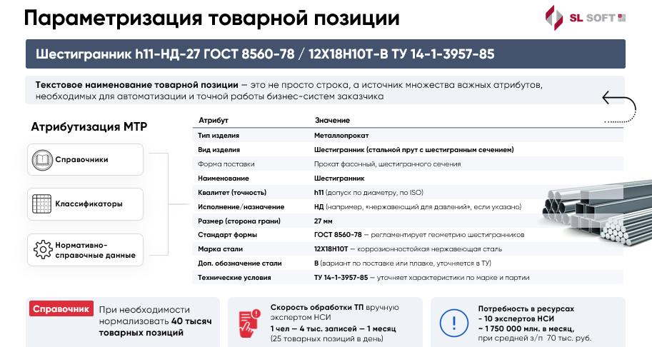 Текстовое наименование товарной позиции в справочнике – сложный объект, содержащий множество атрибутов, необходимых для точной работы как бизнес-систем компании, так и рядовых сотрудников: ведь по ней они должны четко понять, какие у объекта параметры, чем он отличается от других. Среди таких атрибутов, например, – тип и вид изделия, габариты, материал, из которого оно изготовлено и многое другое.