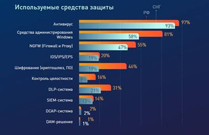 По данным опроса за четыре года (с 2017 года) обеспеченность средствами администрирования выросла на 31%, антивирусными программами на 15%, SIEM-системами – на 7%. Динамика оснащения программами для защиты от утечек данных хуже, DLP-системы стоят в 31% компаний, это только на 3% больше, чем в 2017-м году. При этом число утечек информации также год от года почти не меняется – число пострадавших компаний остается на уровне 60% ежегодно. В подавляющем большинстве потеря данных происходит по причине инсайдерского нарушения или ошибки.
