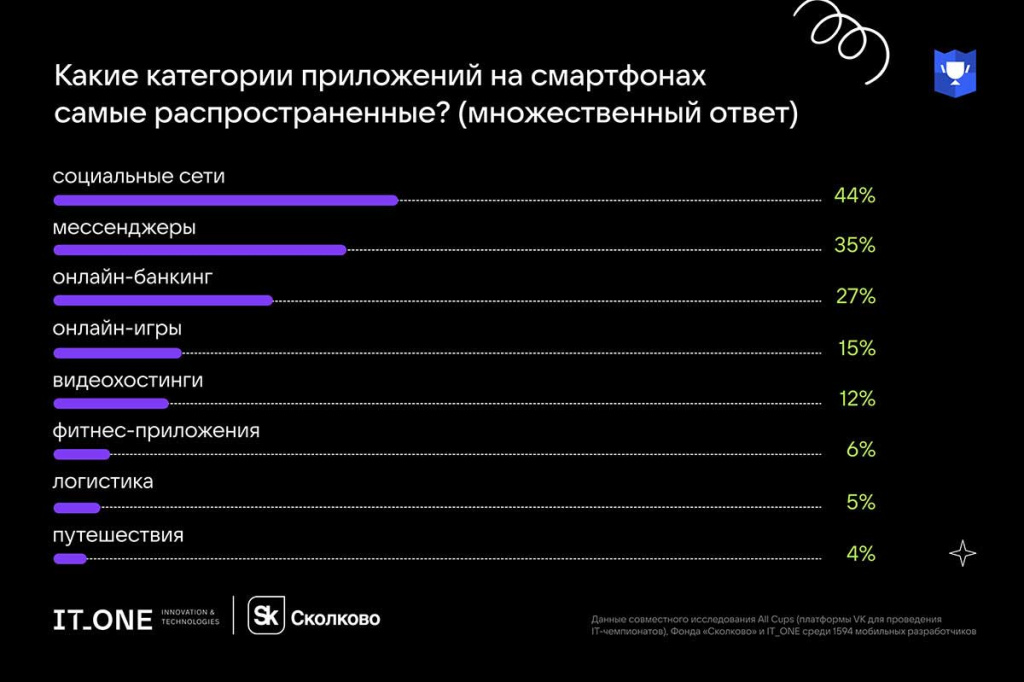 Российские разработчики выбрали самые распространенные приложения. Среди множества ответов наиболее популярными стали социальные сети (44%), мессенджеры (35%) и банковские приложения (27%). Игры (15%) и видеохостинги (12%) заняли четвертую и пятую строчку соответственно. Наименее популярной категорией приложений российские разработчики сочли путешествия (4%).
