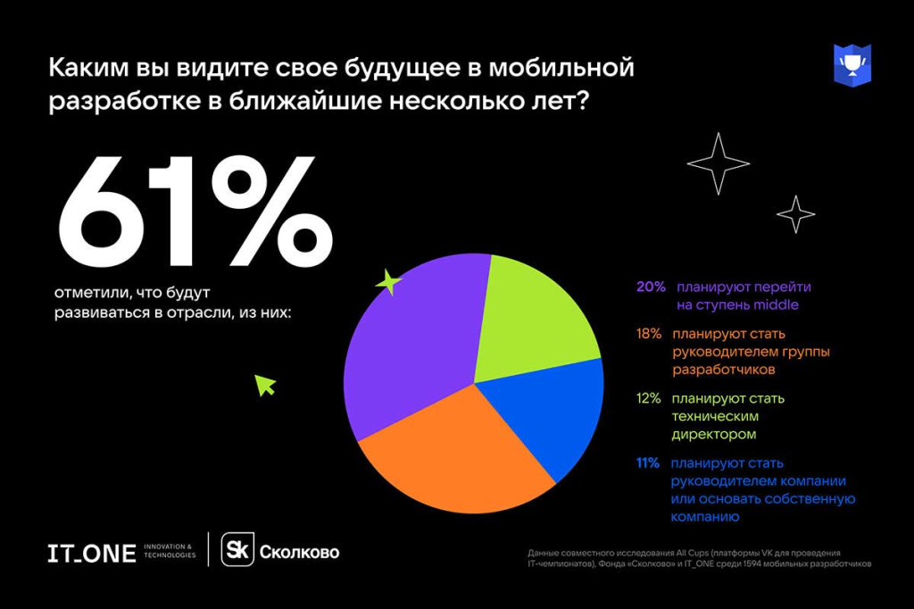 Говоря о профессиональном развитии в мобильной разработке, абсолютное большинство (61%) отметили, что будут развиваться в отрасли: 20% из них планируют перейти на ступень middle, 18% в перспективе видят себя руководителем группы проектов, 12% — техническим директором. Еще 11% в равных долях ориентируются на место руководителя компании или на создание собственного стартапа.