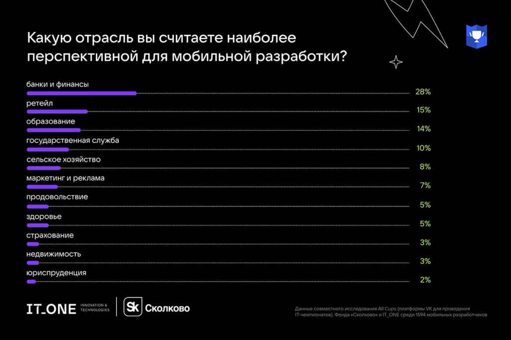 Самым многообещающим рынком для мобильных разработчиков стал финансовый сектор (28%). Также в ТОП-3 рейтинга респондентов вошли ретейл (15%) и образование (14%). Кроме того, каждый десятый респондент наиболее перспективной нишей считает государственную службу.