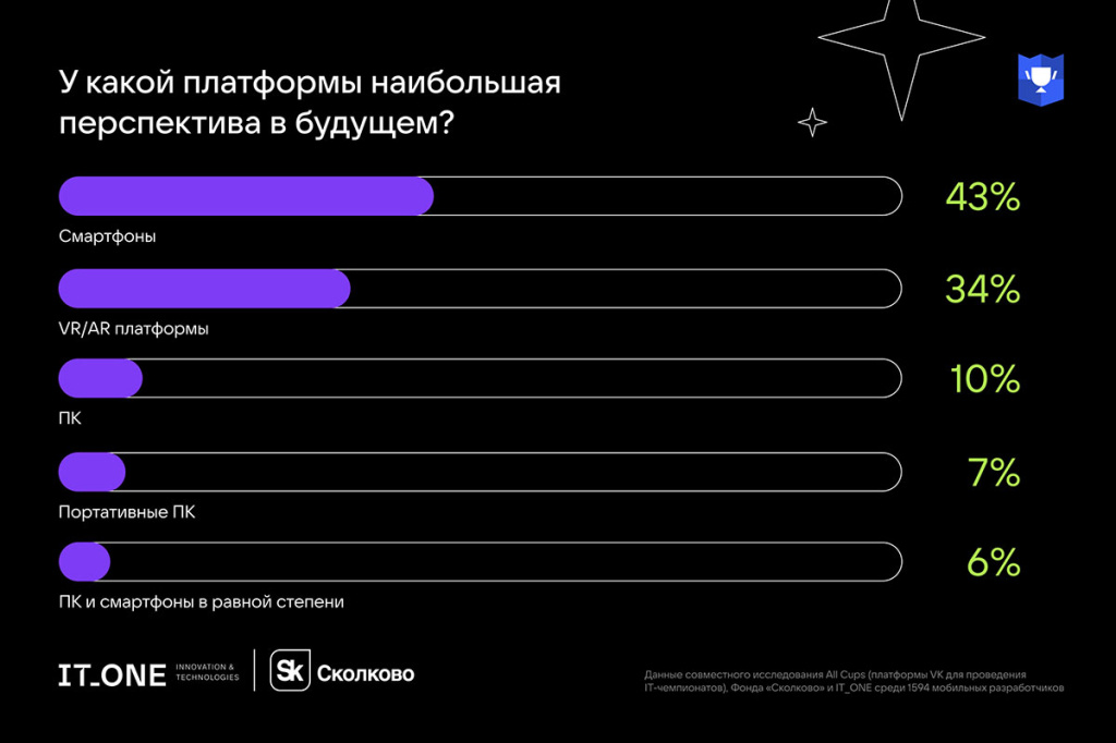 43% ИТ-специалистов считают мобильную разработку наиболее перспективным направлением. 34% отмечают, что в будущем большинство операций будет осуществляться с помощью VR/AR технологий. Еще 10% уверены, что приложения для ПК останутся самыми востребованными у пользователей. 7% опрошенных рассчитывают на портативные персональные компьютеры, еще 6% верят в баланс между ПК и смартфонами. Такие результаты показал опрос 1594 разработчиков, проведенный аналитиками платформы All Cups от VK, Фондом «Сколково» и IT_ONE в рамках чемпионата IT_ONE Cup. Mobile.