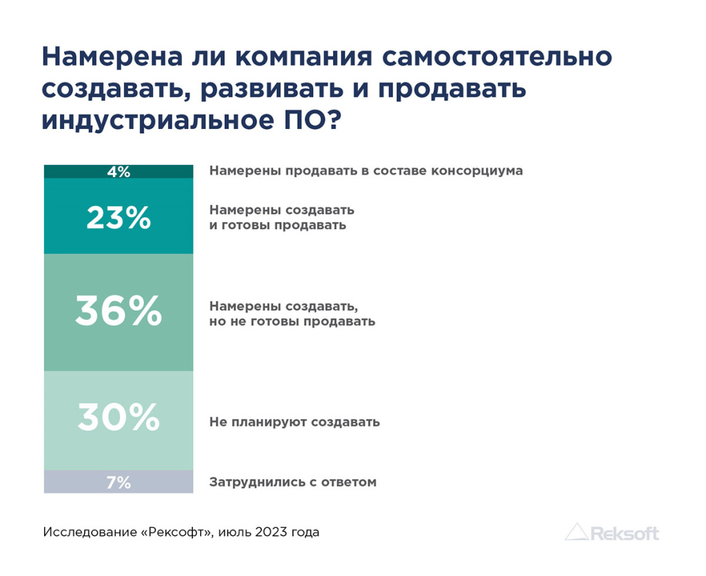 Также компании задаются вопросом о возможности вывода созданного продукта на рынок. 23% участников опроса заявили о готовности предприятия самостоятельно заниматься дистрибуцией своего решения, 4% говорят о необходимости разделения этой задачи с ИТ-партнером, 36% - предполагают сугубо внутренне использование решения в рамках контура своей структуры.