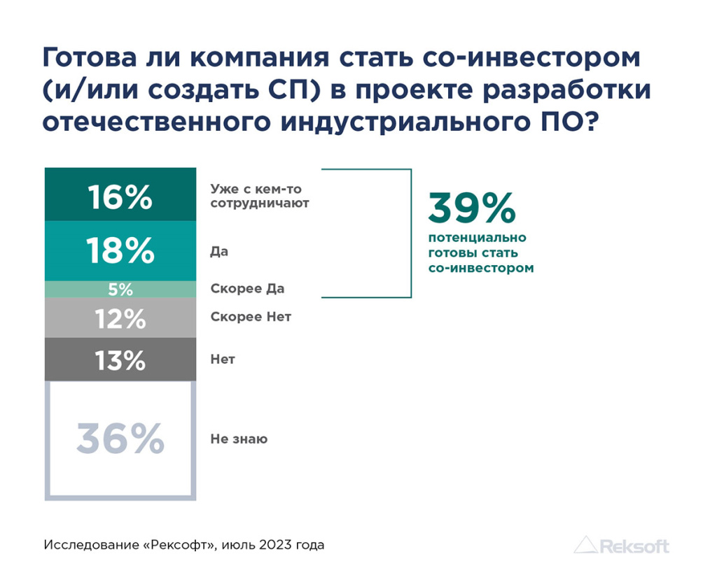 Исследование показало, что 54% предприятий имеют планы полноценной замены западных программных решений на горизонте 3-5 лет. При этом, 39% респондентов сообщили о потенциальной готовности своих компаний стать со-инвестором в проекте создания индустриального ПО, из них 16% уже работают с ИТ-партнером в рамках совместного предприятия. Оптимальный и достижимый срок окупаемости решений сильно зависит от класса решения и объема инвестиций и обозначается компаниями в диапазоне от 3 до 5 лет.