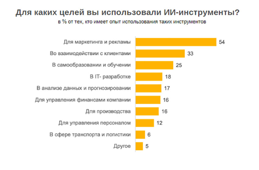 Как показал опрос, бизнес использует инструменты на базе ИИ и нейросетей в разных нишах и для разных целей.