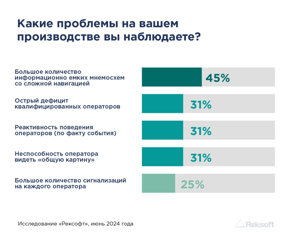 О высокой востребованности темы говорят и результаты проведенного опроса. В числе ключевых проблем существующих операторских интерфейсов специалисты выделяют большое количество информационно емких мнемосхем со сложной навигацией, которые затрудняют работу операторов и повышают риск возникновения ошибок. В ходе опроса актуальность этой темы подчеркнули более 45% респондентов. Еще 31% опрошенных отметили существующий острый дефицит квалифицированных специалистов в области АСУ ТП.