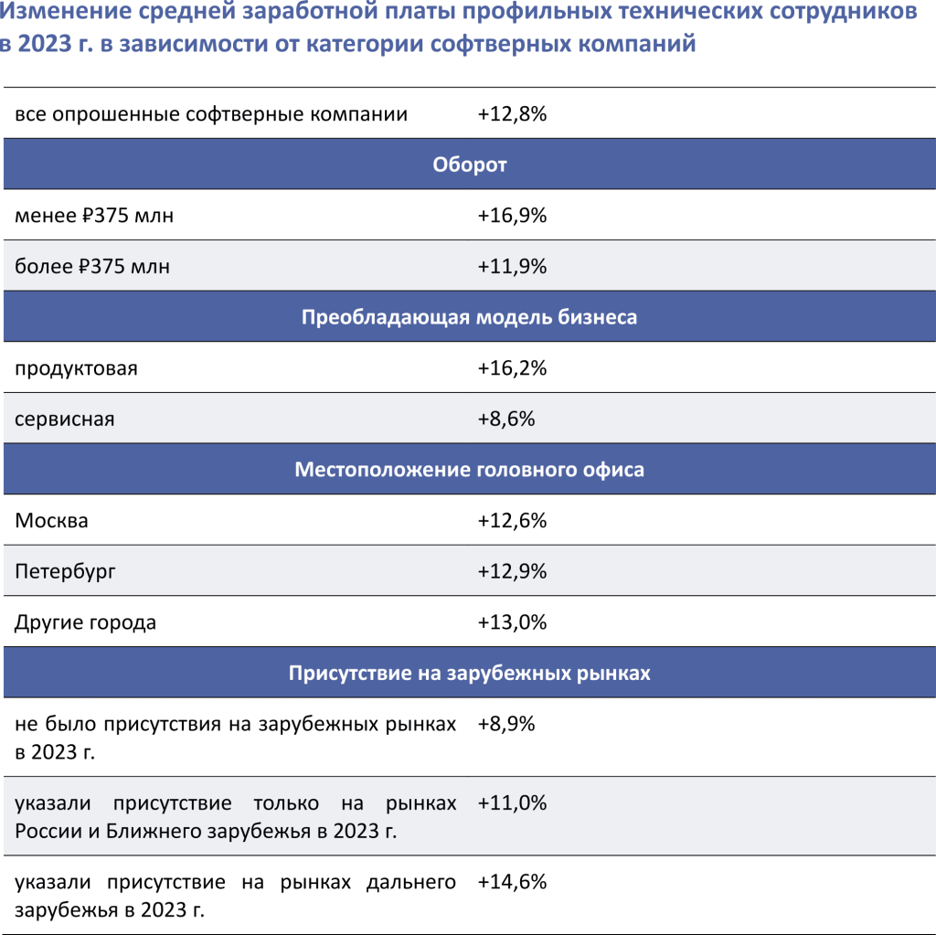 Преимущество по темпам роста средней заработной платы имеют продуктовые компании по отношению к сервисным, а также экспортеры – по отношению к тем компаниям, которые работают только на российском рынке, даже несмотря на резкое сокращение экспортных доходов софтверных компаний.