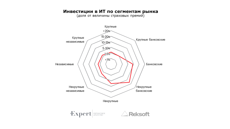 Страховщики, входящие в банковские группы, инвестируют в ИТ больше, чем независимые участники (в % от страховых премий). Для первых доля расходов на ИТ составила в среднем почти 10-15%, в то время как среди небанковских игроков никто не тратит более 10%, а большинство ограничиваются 1-5%.