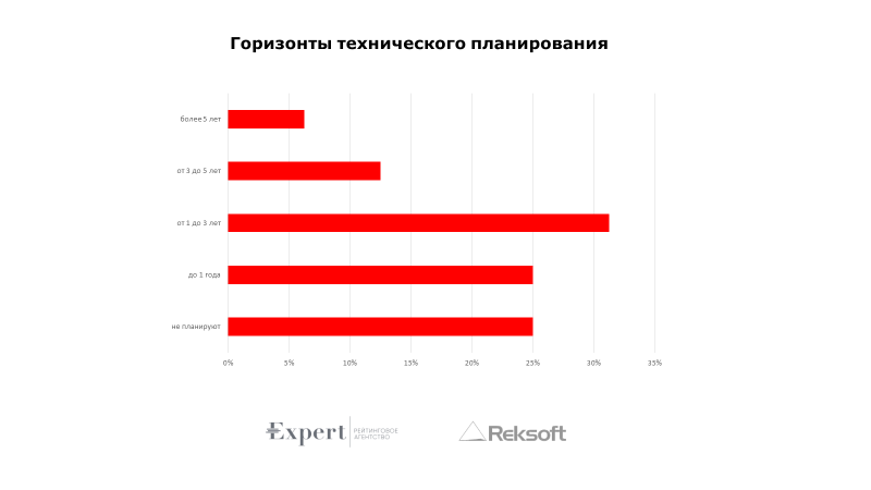 У большинства компаний стратегические планы по внедрению и развитию ИТ-систем охватывают среднесрочный горизонт от 1 года до 3 лет. У 25% страховых компаний глубинное техническое планирование отсутствует.