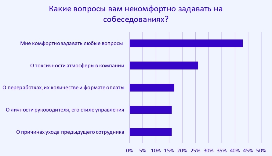 Больше всего люди боятся спрашивать про токсичность (26%), переработки и их оплату (17%), личность руководителя и его стиль управления (16%), а также о причинах ухода предыдущего сотрудника, работавшего на этом месте (16%).