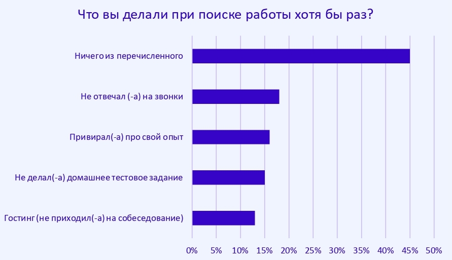 Меньше половины опрошенных (45%) ведут себя честно во время поиска работы. Чаще всего специалисты позволяют себе не отвечать на звонки (18%), привирать про свой опыт (16%), не делать домашнее тестовое задание (15%) и не приходить на собеседование, предварительно подтвердив участие (13%).