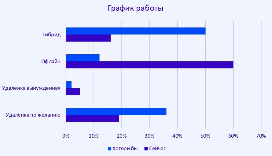 Половина опрошенных мечтает о гибриде, но больше 60% вынуждены работать в офисе