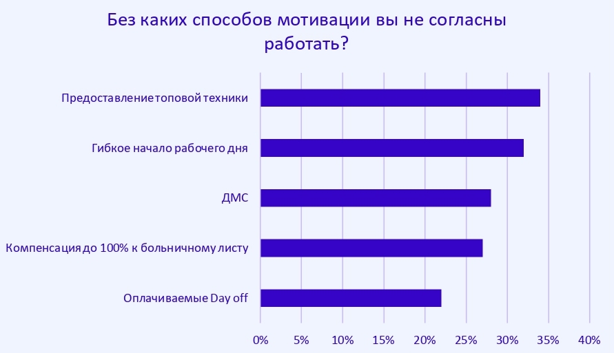 Среди наиболее важных способов опрошенные выделили: предоставление топовой техники (34%), гибкое начало рабочего дня (32%), ДМС (28%), компенсация до 100% к больничному листу (27%), а также оплачиваемые Day off (22%).