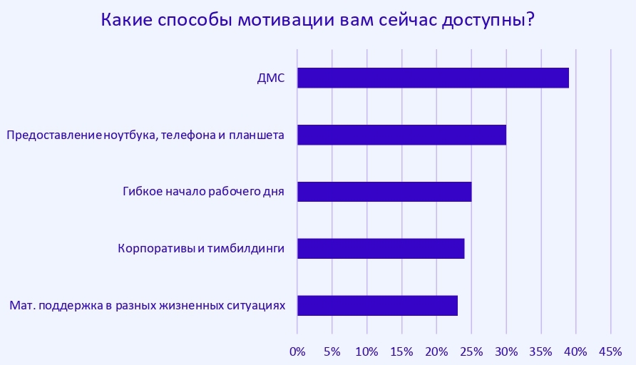 Респонденты рассказали, какие форматы и способы мотивации доступны им на нынешнем месте работы. В топ-5 вошли: ДМС (39%), предоставление техники (30%), гибкое начало рабочего дня (25%), корпоративы и тимбилдинги (24%), а также материальная поддержка в разных жизненных ситуациях (23%).