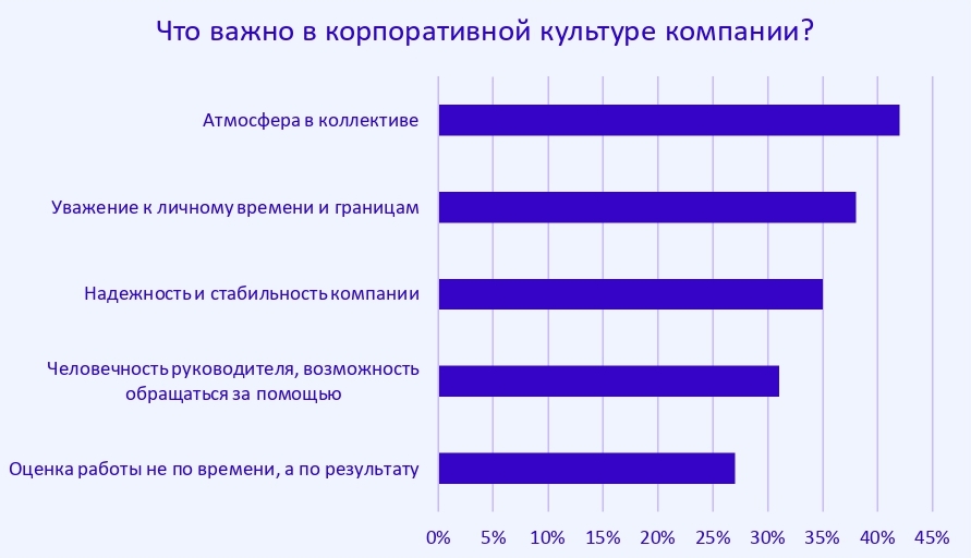 Как показал опрос, для большинства респондентов самыми важными корпоративными ценностями являются атмосфера взаимопомощи в коллективе (42%), уважение к личному времени и границам (38%), а также надежность и стабильность компании (35%).