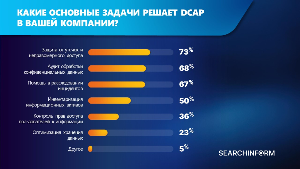 Эксперты «СёрчИнформ» выяснили, какие задачи решает DCAP-система в российских компаниях. Топ-3 задачи: защита от утечек и неправомерного доступа (73%), аудит обработки конфиденциальных данных (68%) и помощь в расследовании инцидентов (67%). Каждая вторая компания использует DCAP для оптимизации файловых хранилищ.*