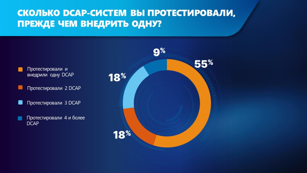 Больше половины (55%) опрошенных компаний внедряют DCAP-систему одного вендора после первого теста. 36% – перед внедрением тестируют 2-3 продукта разных вендоров. 9% – ответили, что протестировали 4 и более системы, прежде чем принять решение о покупке.