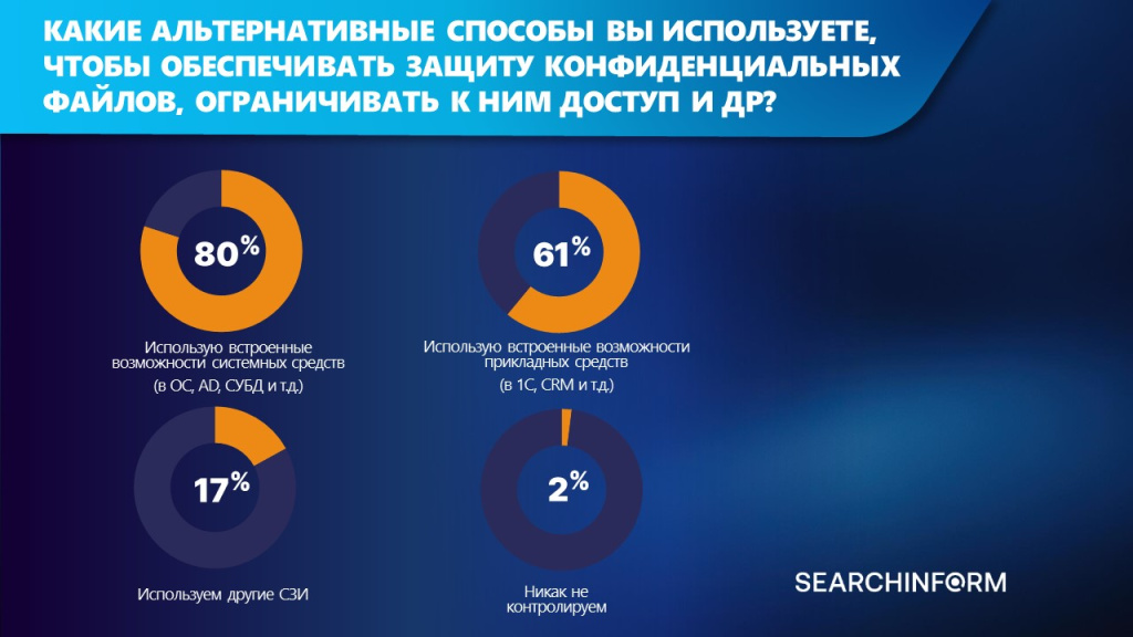 ИБ-специалисты ответили, с помощью каких альтернативных инструментов обеспечивают защиту конфиденциальных данных. 80% – используют встроенные возможности системных средств (в ОС, AD, СУБД и т.д.), 61% – используют встроенные возможности прикладных средств (в 1C, CRM и т.д.), 17% – используют различные СЗИ.*