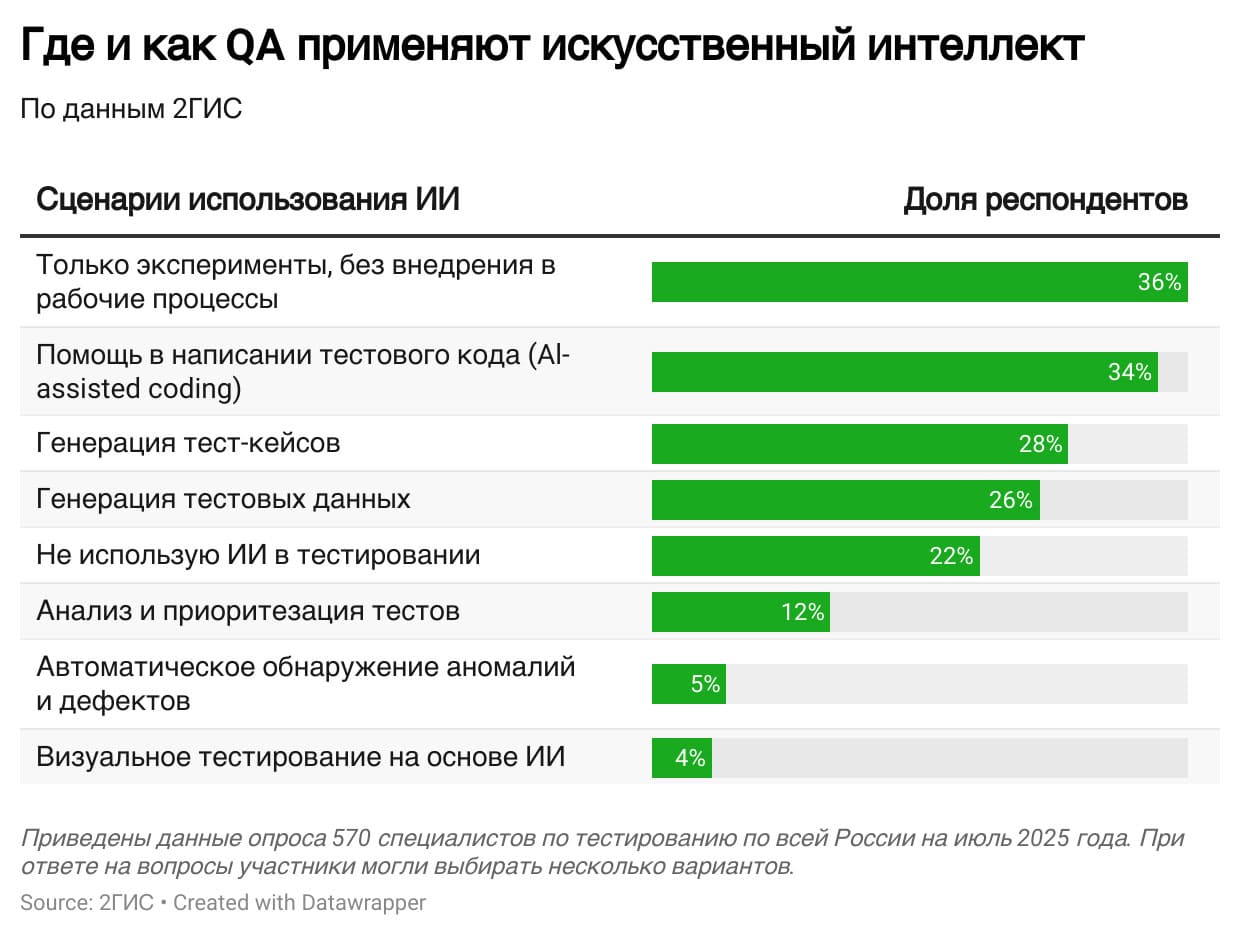 2ГИС провел исследование о том, как меняется работа и роль тестировщиков в IT-компаниях — оно показало, в частности, что ИИ среди QA-специалистов, отвечающих за тестирование продукта, в основном используется для решения стандартных задач — написания кода и создания тест-кейсов. Лишь 12% профессионалов задействуют технологию в аналитике, а 22% не применяют вовсе.