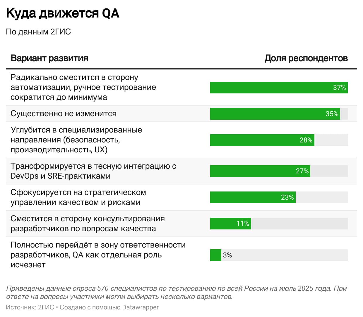 Мнения о будущем QA разделились: 37% предсказывают радикальный сдвиг в автоматизацию, а 35% считают, что ничего не изменится. Почти треть респондентов ожидают углубления роли QA в специализированных направлениях, таких как безопасность и производительность. 27% инженеров связывают развитие профессии с тесной интеграцией в процессы непрерывной разработки и эксплуатации — DevOps-практики, направленные на ускорение выпуска качественного ПО, и SRE-подходы, ориентированные на обеспечение надежности систем.