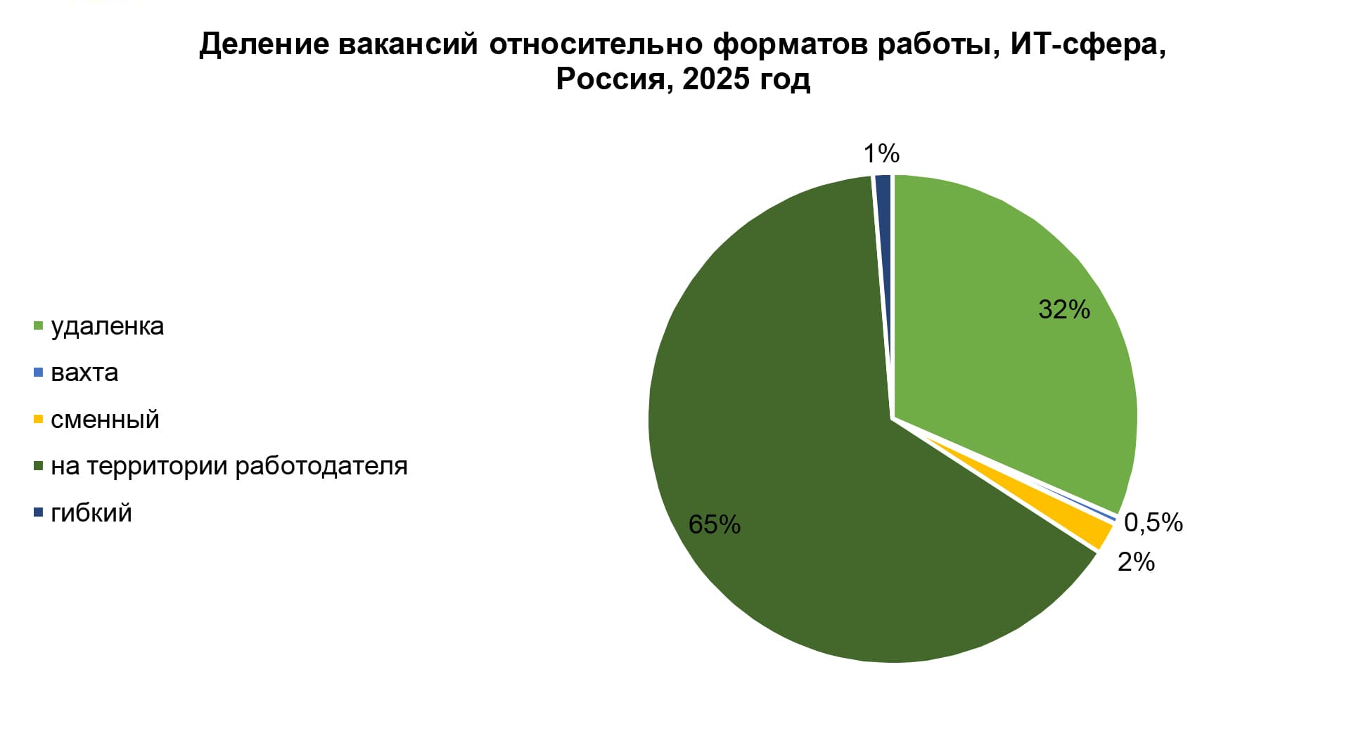 Компромиссом в этом столкновении интересов становится гибридный график, набравший популярность после пандемии. Как допустимый вариант он упоминается в вакансиях за 2025 год 69 000 раз, что составляет чуть менее четверти всех предложений о работе. Тем не менее это на 11% больше, чем за аналогичный период прошлого года, из чего можно сделать вывод, что гибрид остается неким запасным планом для работодателей. Он задействуется как аргумент в переговорах с ИТ-специалистами, которые в целом готовы рассматривать переход в офис, но не на всю неделю.