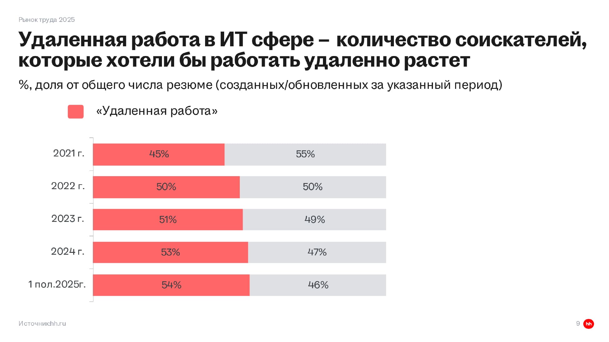 «Удаленка все еще остается в сердцах соискателей, – комментирует Мария Игнатова, директор по исследованиям hh.ru. – В более чем 50% резюме ИТ-специалистов указано желание работать именно дистанционно, причем эта доля держится и не снижается начиная с 2022 года, а в первом полугодии 2025 года прирост удаленных вакансий составил 14%. Тем не менее сейчас именно гибридный формат, набирающий обороты, выглядит как комфортная точка пересечения, где сходятся интересы и работодателей, и соискателей».