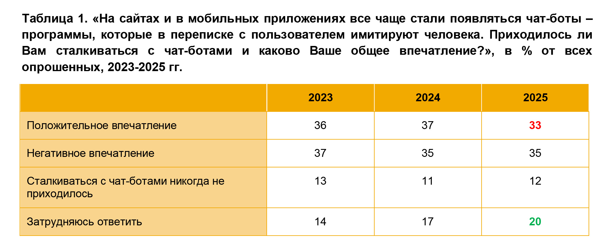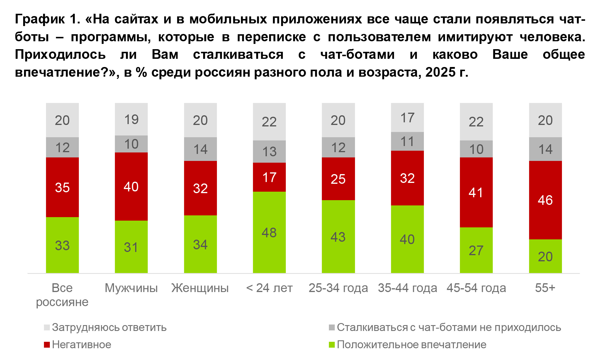 Использование чат-ботов и виртуальных ассистентов стало неотъемлемой частью цифрового опыта россиян: 9 из 10 человек сталкивались с такими технологиями на сайтах и в приложениях. При этом оценки полярные: треть пользователей оценивают опыт положительно, почти столько же — отрицательно. За последний год доля положительных оценок снизилась на 4 п.п. с 37% в 2024 году до 33% в 2025 году.