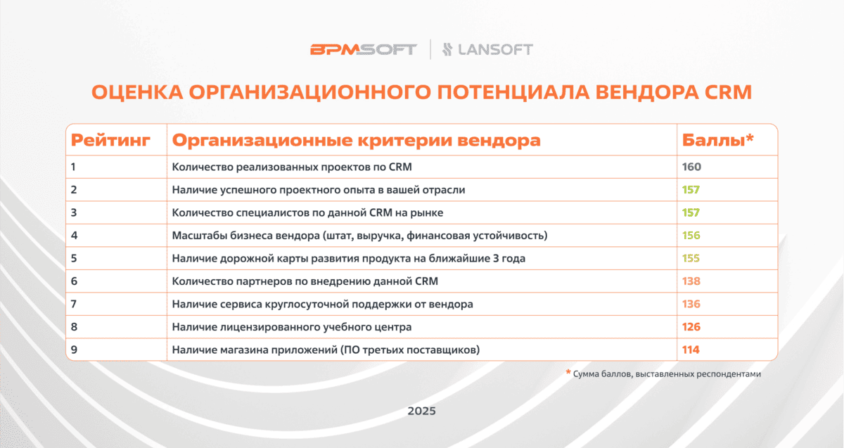 Об исследовании. В исследовании приняли участие 50+ руководителей крупных российских компаний. Респонденты представляют широкий спектр отраслей: от ИТ и телекоммуникаций до банковского сектора, металлургии, машиностроения, фармацевтики, розничной торговли, товаров народного потребления и нефтехимии. Почти половину выборки составили директора по ИТ и цифровой трансформации. Остальные участники – коммерческие директора, руководители по продажам и маркетингу, а также владельцы продукта CRM. Методология основана на глубинных экспертных интервью в формате ВКС (видеоконференцсвязь). Период проведения – июль-август 2025 года. В рамках опроса заказчикам предлагалось оценить по пятибалльной шкале приоритетность функциональных и технологически критериев, характерных для комплексной CRM-системы, а также организационный потенциал вендора.