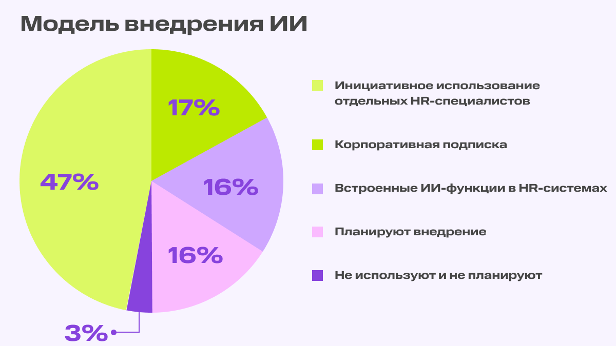Искусственный интеллект перестал быть экспериментом для HR-функции: компании уже применяют его в подборе, обучении и автоматизации рутинных процессов. 97% респондентов так или иначе используют ИИ-решения в работе или планируют это в ближайшие 1-2 года. Однако в большинстве организаций внедрение ИИ происходит не системно, а инициативно – по решению самих HR-специалистов. Лишь около трети респондентов сообщили, что ИИ в их компаниях развернут централизованно – через корпоративные подписки или встроенные функции в HR-системах.