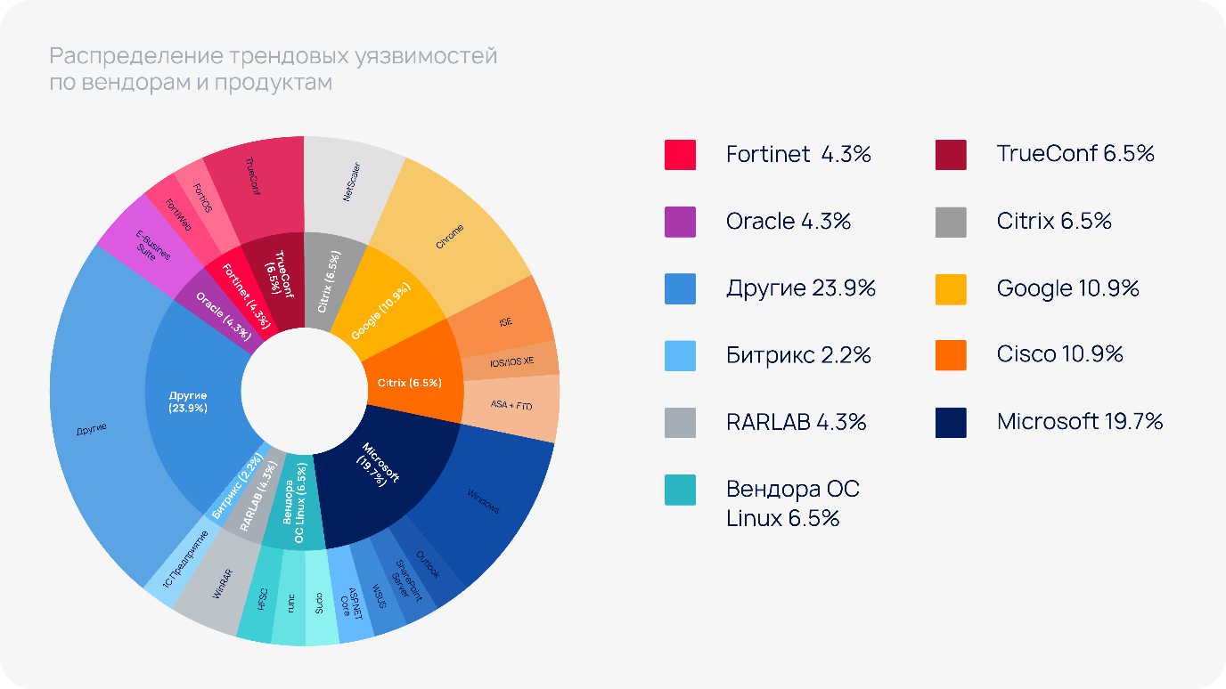 По данным R-Vision, наибольшее количество критичных уязвимостей в 2025 году пришлось на продукты Microsoft (19,7%), Cisco (10,9%) и Google (10,9%).