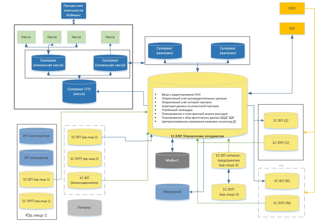 - В рамках проекта была произведена централизация процессов казначейства и бюджетирования, которые по большей части выполнялись в ручном режиме. Подход к ведению проекта предполагал плавный переход предприятий, входящих в периметр автоматизации, на ведение всех видов учета в системе «1С:ERP.Управление холдингом». На период, пока предприятия работали в старых информационных системах, с ними типовыми средствами настраивалась интеграция для сбора фактических данных. На первом этапе был произведен апгрейд «1С:Управление торговлей 11», используемой в одном из распределительных центров, до «1С:ERP.Управление холдингом», что для конечных пользователей, занимающихся оперативным учетом, прошло практически незаметно. В рамках этого этапа также был переведен учет нескольких небольших юридических лиц в централизованную систему. По всем организациям, переведенным в «1С:ERP.Управление холдингом», бухгалтерский и налоговый учет ведется внутри системы (за исключением кадрового учета и учета заработной платы). Также в рамках данного этапа были автоматизированы процессы казначейства по юрлицам, ведущим учет в базе (заявочная кампания, управление обязательствами, учет договоров, платежный календарь, формирование реестров, финансовые инструменты).