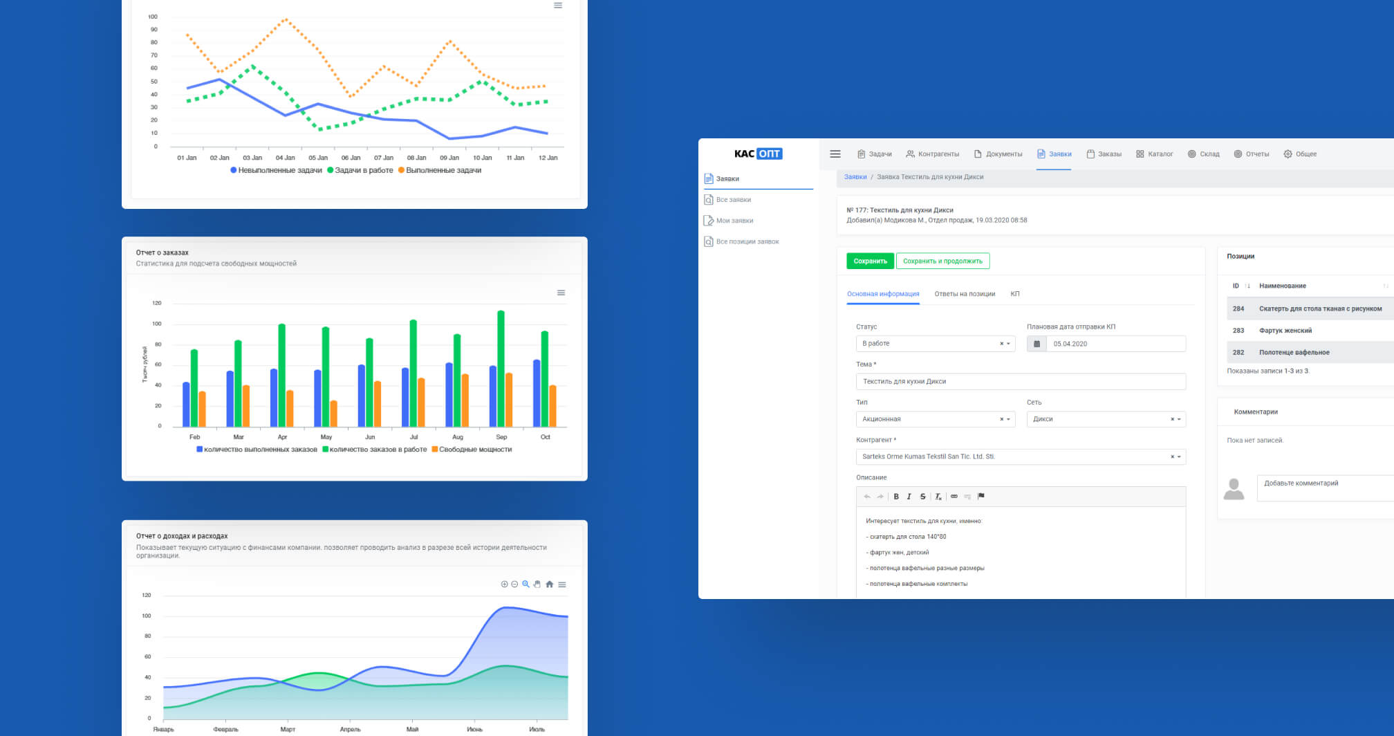 Модуль заявок позволил отделу продаж оформлять запросы на товары от заказчика, на стоимость товара в отдел производства в специальных формах. В автоматическом режиме формирует коммерческие предложения, учитывающие уникальные условия договоров с клиентами.